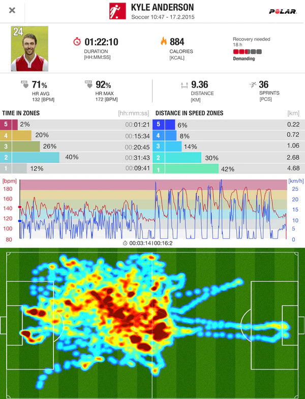 - Detailed data collection: Heart rate, speed (10 Hz GPS), acceleration, distance, sprint count, running cadence, and calories burned